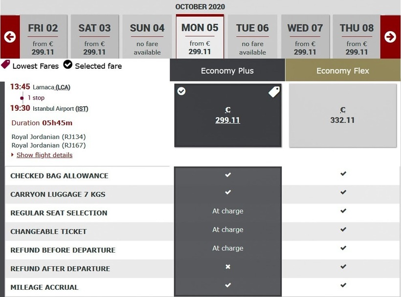 Royal Jordanian уступает греческим авиакомпаниям в расписании рейсов. В весенне-летнее время самолеты иорданского оператора летают во все дни недели, кроме вторника и воскресенья. С двухчасовой стыковкой в Аммане перелет занимает 5,5 часа. В ноябре–марте советую преодолевать путь с данным перевозчиком по понедельникам и пятницам, когда авиапутешествие длится также 5,5 ч. В остальные дни недели осенне-зимнего периода авиаперелеты нецелесообразны, потому что они включают девятичасовую ночную стыковку. Проигрывает Royal Jordanian и по стоимости авиабилетов: туда можно купить за 24500 ₽ (300 €), в обе стороны — от 29000 ₽ (350 €). Даже самые дешевые тарифы у оператора включают провоз багажа, поэтому тем, кто путешествует с ручной кладью, сэкономить не удастся. Бизнес-класс — от 59500 ₽ (725 €).
