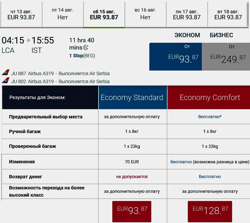 С Air Serbia можно преодолеть путь в весенне-летнее время по понедельникам, четвергам и субботам, в ноябре–марте самолеты летают только по понедельникам. С пересадкой в Белграде длительностью 6–7,5 ч. путешествие занимает 10,5–11,5 ч. Во время дневной стыковки можно успеть в столице Сербии, например, прогуляться по кварталу Скадарлия или посмотреть крепость Калемегдан. Главная причина, по которой я могу порекомендовать выбрать данную компанию в качестве перевозчика, — дешевые авиабилеты. Полет туда с багажом у Air Serbia стоит всего от 8000 ₽ (94 €), если забронировать места и на обратную дорогу, это обойдется от 13000 ₽ (158 €). Бизнес-класс — от 20500 ₽ (250 €).