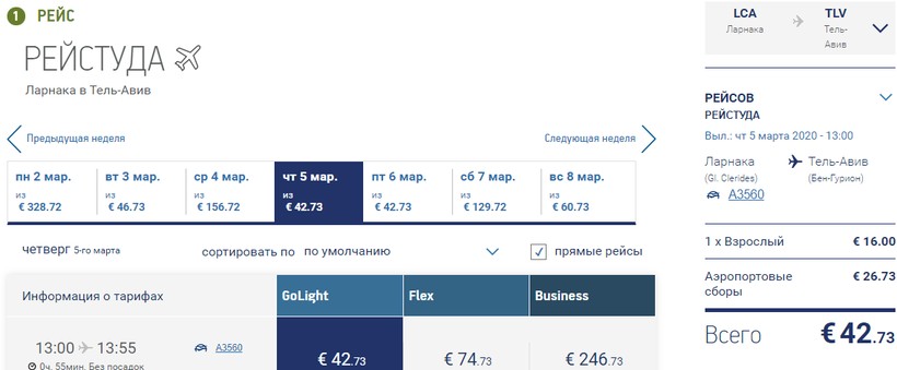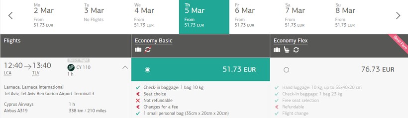 Стоимость билетов начинается от 51 евро (3500 рублей). Проанализировав ценовую политику компании, могу отметить, что брать их заранее не обязательно, цена от этого не изменится, так как отсутствует динамическое ценообразование. Выбор тарифов небольшой, предусмотрен Economy Basic и Economy Flex. Когда я пользуюсь услугами Cyprus Airways, то чаще беру первый тариф — он более дешевый, туда входит ручная кладь и багаж, вес которого не должен превышать 10 килограмм. Если же у вас много вещей, тогда рекомендую взять второй тариф (он стоит дороже на 25 евро/1700 рублей), куда включен провоз чемоданов весом не более 23 килограмм. Бонусом будет возможность выбрать места на борту лайнера и обменять/вернуть авиабилет в случае необходимости.