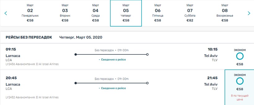| El Al (LY 5132) Boeing 737 | 09:10 Ларнака (LCA) | 1 ч. 05 мин | 10:15 Тель-Авив (TLV) | 22, 23 октября, 1, 9, 15, 16, 22, 23, 29, 30 апреля, 6, 7, 13, 14, 20, 21, 27, 28 мая, 3, 4 июня, … |