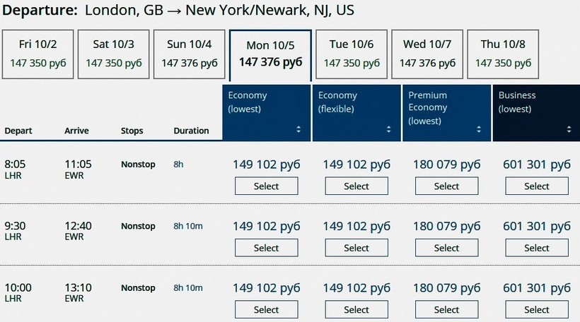| Virgin Atlantic (VS 45) Airbus A330-900 | 12:25 Лондон (LHR) | 8 ч. 05 мин | 15:30 Нью-Йорк (JFK) | 15 октября |