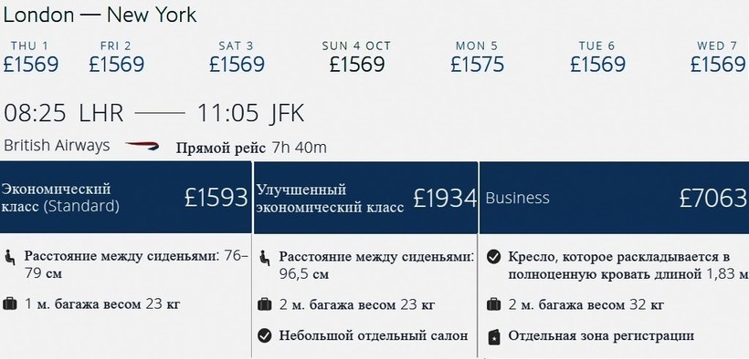 | British Airways (BA 175) Boeing 777 | 10:00 Лондон (LHR) | 7 ч. 45 мин | 12:45 Нью-Йорк (JFK) | ежедневно по 25.10 |