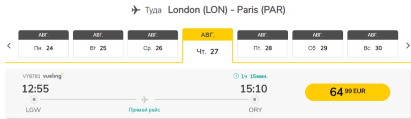 | Vueling airlines (VY 8943) Airbus А320 | 07:40 Лондон (LGW) | 1 ч. 30 мин | 10:10 Париж (ORY) | 21, 22 октября |