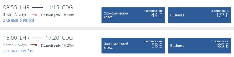 | British Airways (BA 302) Airbus A320 NEO | 08:25 Лондон (LHR) | 1 ч. 20 мин | 10:45 Париж (CDG) | чт с 02.04 |