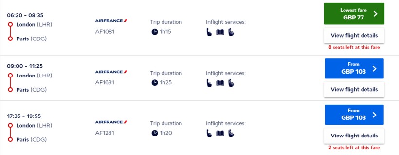 Крупнейший оператор Великобритании совершает полеты из Лондона в Париж один/два раза в сутки.