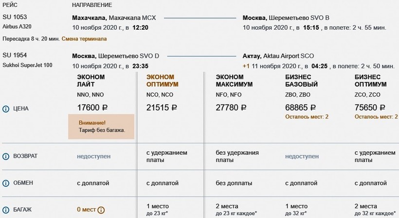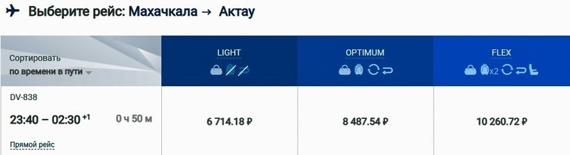 У SCAT расписание полетов не самое удобное — самолеты этого казахстанского оператора летают лишь с апреля по конец октября. В апреле и октябре рейсы выполняются только по понедельникам, в мае–сентябре — еще и по средам. Вылет ночной, авиапутешествие занимает менее 1 часа. Полет с данным авиаперевозчиком могу отнести к недорогим: в одну сторону билет с багажом (тариф Optimum) стоит от 8500 ₽, туда-обратно — от 17000 ₽. С ручной кладью (тариф Light) путешествие дешевле примерно на 1700 ₽. SCAT предлагает перелет только в экономклассе.