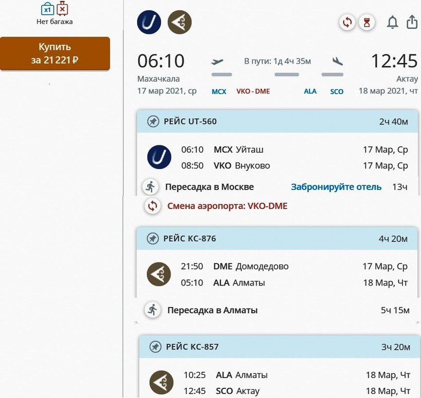 Наиболее удобные варианты перелетов из российской Махачкалы в казахстанский Актау предлагают компании: