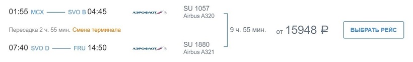 Red Wings (WZ 4751) Сухой Суперджет 100 | 14:20 Махачкала (MCX) | 3 ч. 15 мин | 20:35 Бишкек (FRU) | 29 июля, 5 августа |