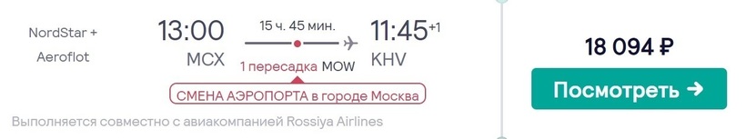 Авиаперевозчики «Аэрофлот» (по факту полетите с а/к «Россия») и «НордСтар» предлагают транзитный перелет по маршруту Махачкала — Москва —Хабаровск продолжительностью 15,5 ч. В это время входит и стыковка в столице РФ (5,5 ч.). Требуется смена воздушной гавани: из Шереметьево нужно попасть в Домодедово. Учитывая, что времени на пересадку отводится не так много, придется ехать на такси. Стоимость перелета — от 18000 рублей (за неделю и более), цены стабильные.