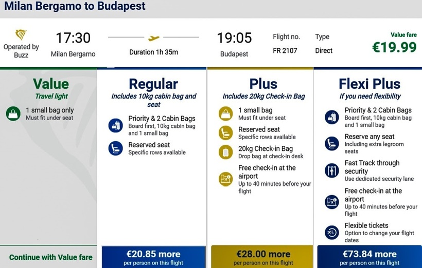Зато доплата за багаж у данного оператора ниже, чем у венгерской бюджетной компании — составляет 2100 ₽ (28 €) в одну сторону. Поэтому могу рекомендовать полет с Ryanair любителям путешествовать с большими чемоданами. Бизнес-класса у ирландского авиаперевозчика также нет. Как я упоминала, цены действительны в течение трех месяцев, а покупать авиабилеты за больший срок до вылета не советую, потому что стоимость за 4–12 месяцев до даты отправления выше в среднем на 1000–2000 ₽ (15–25 €). Кстати, билеты по изменяемому тарифу Flexi Plus у перевозчика дороже, чем по тарифу Value (минимальная цена), на 4200 ₽ (55 €).