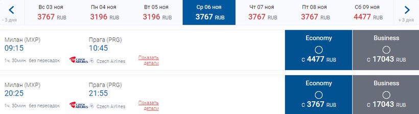 Easyjet (U2 3909) Airbus А321 | 06:10 Милан (MXP) | 1 ч. 30 мин | 07:40 Прага (PRG) | 18, 25 октября |