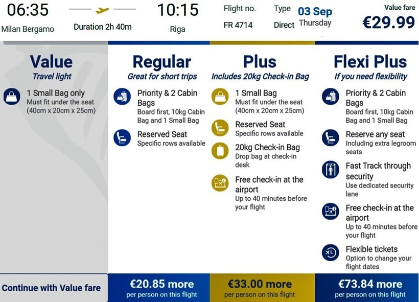 С Ryanair в весенне-летнее время можно преодолеть путь по вторникам, четвергам и субботам, с конца октября по конец марта оператор выполняет авиарейсы еще по пятницам и воскресеньям. У этой бюджетной компании есть существенное преимущество перед вышеупомянутым перевозчиком в стоимости билетов: в одну сторону с ручной кладью можно купить за 2400–3700 ₽ (30–47 €), туда-обратно проездные обойдутся от 5200 ₽ (66 €). Путешествие с багажом стоит 5000–6300 ₽ (63–80 €) и от 10400 ₽ (132 €) соответственно. Бизнес-класс Ryanair не предлагает.