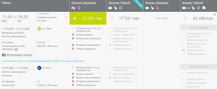 Авиаоператоров, предлагающих прямые авиарейсы по маршруту Минеральные Воды — Кишинев, нет. Приготовьтесь лететь транзитом. За 6,5 ч. до конечного пункта доберетесь с S7 и Air Moldova. Стыковка в Москве, в Домодедово. Продолжительность пересадки — 2,5 часа. Между данными авиаоператорами заключено так называемое код-шеринговое соглашение, полетите по единому билету. Если говорить про самый оптимальный авиатариф в экономическом классе обслуживания, то он называется «Гибкий». По его условиям можно взять с собой и ручную кладь, и багаж. Есть ограничения по весу — 10 и 23 кг соответственно. Выбор места в салоне самолета для этого тарифа является бесплатным.