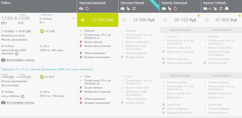 У российского авиаоператора на борту воздушного судна два класса обслуживания — эконом и бизнес. Если стоит задача купить максимально дешевый билет до Дюссельдорфа — выбирайте стартовый тариф эконома «Базовый». Только учтите, что лететь придется с ручной кладью (багаж платный). Авиабилет невозвратный — откажетесь от поездки — потеряете все деньги. S7 дает возможность оптимизировать расходы на перелет. Для этого нужно сразу оплатить билет в обратную сторону. В таком случае перелет в один конец обойдется в 6200 рублей.