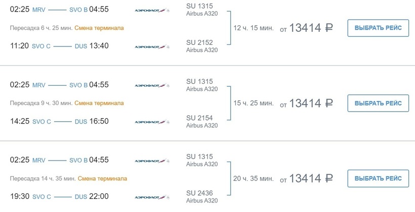 Через столицу РФ в Дюссельдорф можно долететь с «Аэрофлотом». Главный авиаоператор страны ежедневно предлагает не менее пятнадцати вариантов транзитных рейсов со стыковкой в Шереметьево. Время в пути разное: от 7,5 часов до суток с небольшим. Соответственно продолжительность стыковок в Москве — от 2 до 21 часа. Теперь про стоимость билетов: она стартует с 13400 рублей. Билет по такой цене можно приобрести за месяц до поездки. Стоимость авиабилетов в период новогодних или других популярных праздников меняется, «Аэрофлот» увеличивает ее минимум на 15 %. Если летите в периоды, когда спрос на авиаперелеты высокий, покупайте авиабилеты за полгода вперед.