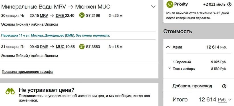 Советую купить билет заранее (за 1–2 месяца), чтобы не переплачивать. Тогда самый дешевый обойдется вам в 10500 ₽ — с ручной кладью и около 12500 ₽ — с багажом.