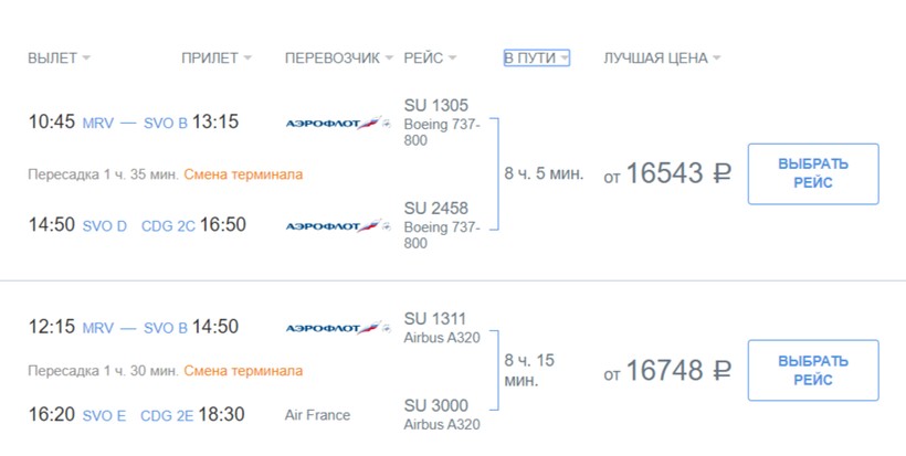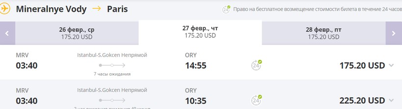 Стоимость перелета начинается от 17000 рублей. Динамическое ценообразование отсутствует, поэтому не буду советовать заранее оплачивать поездку. Однако хочу отметить, что для экономии можно купить билеты туда и в обратном направлении одновременно, это будет выгоднее, нежели приобретать их отдельно. Перелет по маршруту Минеральные Воды — Париж — Минеральные Воды обойдется вам в 27000 рублей.