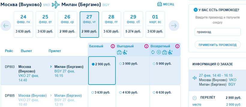 Этот вариант подойдет тем, кому не жалко потратить 18 часов своего времени. Первая часть маршрута проходит с Utair, самолет этой компании домчит вас до Москвы. Вылеты осуществляются ежедневно рано утром. Затем предстоит пересадка во Внуково продолжительностью 6 с половиной часов в ожидании рейса до Милана. Ехать гулять не советую, ведь на дорогу уйдет минимум 2 часа, а стыковка самостоятельная, нужно будет заново проходить регистрацию, таможенный и паспортный контроль, сдавать багаж. Лайнер российского лоукостера «Победы» вылетает дважды в день, можно постараться успеть на утренний рейс, тем самым сократив время путешествия на 4 часа, но я не советую этого делать. Во-первых, двух часов может не хватить, чтобы совершить все предполетные формальности, тем более, если первый самолет задержится. Во-вторых, дневной вылет обойдется вам дешевле почти на 1000 рублей.