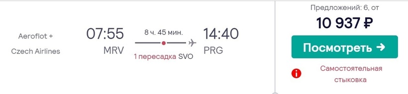 Прямое сообщение отсутствует, в столицу Чехии летаю транзитом. По параметрам цена/качество/время в пути/количество рейсов многие выбирают «Аэрофлот». В дороге проведете от 7 часов до суток. Есть совместные рейсы с а/к «Россия». Минимальная стоимость авиабилета — 18,5 тысячи (не важно бронируете за несколько дней или за пару месяцев до вылета самолета). В экономкласс предлагается 3 тарифа: