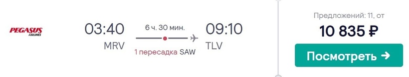 Самый быстрый способ попасть из Минеральных Вод в Тель-Авив — взять билет на самолет а/к Pegasus Airlines (турецкий лоукостер). Есть один ежедневный перелет (кроме субботы), длительность которого 6,5 часа (вместе с 2-х часовой стыковкой в аэропорту Стамбула — Сабиха Гёкчен). Стоимость авиабилета накануне вылета — от 10800 рублей. Обратный обойдется в такую же сумму.