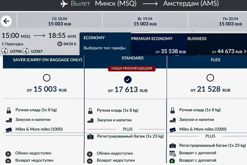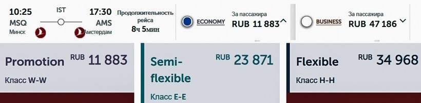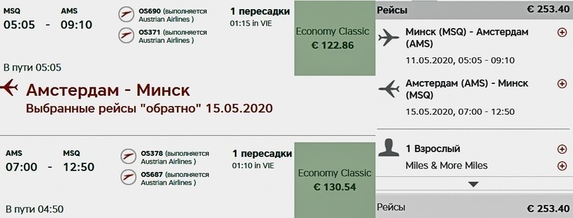 Однозначно лидирует по времени полета прямой перевозчик Belavia, с которым я предпочитаю преодолевать маршрут. Авиабилеты в одну сторону у этой компании самые дешевые, а стоимость путешествия туда-обратно сопоставима с ценами транзитных операторов. В случае, если вам нужно долететь до столицы Нидерландов в одну сторону, а билеты у белорусской авиакомпании дорогие, советую выбрать путешествие на крыльях «Турецких авиалиний». Путешествие с этим оператором только туда будет дешевле на 1500–3000 ₽, чем у LOT, и на 20000–21500 ₽, чем у Austrian Airlines. Цена полета в обе стороны у упомянутых мной транзитных перевозчиков одинаковая. Но преодолевать маршрут туда-обратно лучше с польской или австрийской авиакомпаниями, потому что путешествие с ними занимает по времени на 3,5 часа меньше, чем с «Турецкими авиалиниями».