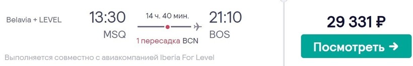 Авиакомпании «Белавиа» и Iberia (крупнейший перевозчик Испании) предлагают один из самых дешевых транзитных перелетов до Бостона с одной стыковкой. Билеты — от 29300 рублей. По такой цене их можно купить за три месяца до поездки.