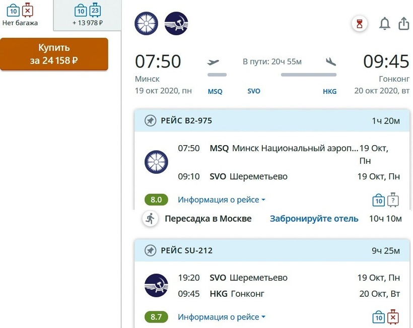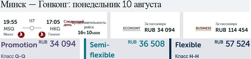 Билеты «туда-обратно» в сентябре обойдутся вам всего в 63 237 рублей, а в январе придется заплатить за них не менее 77 571 рубль. В среднем же, долететь до Гонконга и вернуться в Минск можно за 67 712 рублей.