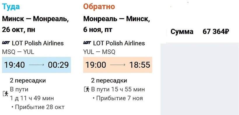 Билеты “туда-обратно” обойдутся вам в 104 218 - 115 188 рублей. В среднем же, долететь до Монреаля и вернуться в Минск можно за 109 703 рубля.