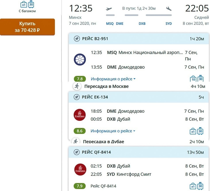 С Belavia и Emirates улететь по направлению можно по понедельникам, средам, пятницам и воскресеньям дважды в день (рейс дневной и вечерний). С пересадкой в Москве в 4 ч. (2,5 ч.) и Дубае в 2 ч. (4,5 ч.) полет занимает 26,5–27,5 ч. Путешествие с этими операторами также не могу назвать дешевым: только туда авиабилет обойдется от 70500 ₽, в обе стороны — от 120000 ₽. Минимальная стоимость включает провоз багажа. Бизнес-класс — от 297000 ₽.