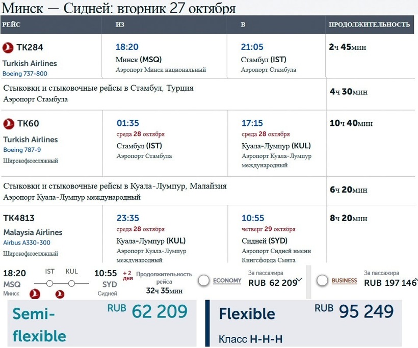 Turkish Airlines и Malaysia Airlines с апреля по ноябрь совершают авиаперелеты во все дни недели, за исключением понедельника и пятницы. В осенне-зимнее время лайнеры компаний летают только по вторникам, четвергам и воскресеньям. Авиарейсы выполняются через Стамбул и Куала-Лумпур, стыковки занимают 4,5 и 6,5 часа соответственно, все путешествие длится 32,5 ч. Если сравнивать с вышеописанными перевозчиками, полет с данными авиаоператорами могу отнести к недорогим: в одну сторону стоит с багажом (весом до 30 кг) от 62500 ₽, если купить авиабилет и на обратную дорогу, это обойдется от 95500 ₽. Цена бизнес-класса — от 197000 ₽.
