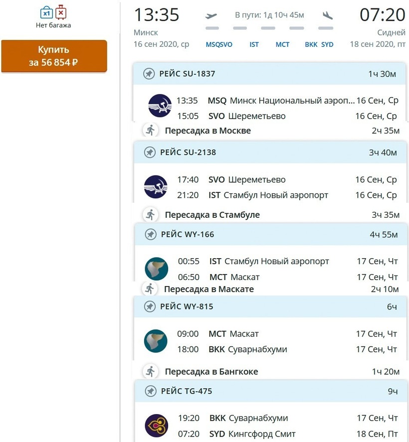 Очень дешевые авиабилеты по направлению найти не удастся, так как расстояние между городами большое. Но туристам, которые летают налегке и хотят немного сэкономить, могу рекомендовать длительные рейсы с самостоятельными стыковками (напомню, вышеописанные компании тариф без багажа не предлагают). Например, преодолеть маршрут можно с «Аэрофлотом», Oman Air и Thai Airways за 34,5 ч. (включая пересадки в 2,5 ч. в Москве, 3,5 ч. в Стамбуле, 2 ч. в Маскате и 1,5 ч. в Бангкоке). Полет в одну сторону стоит от 57000 ₽ (с ручной кладью).