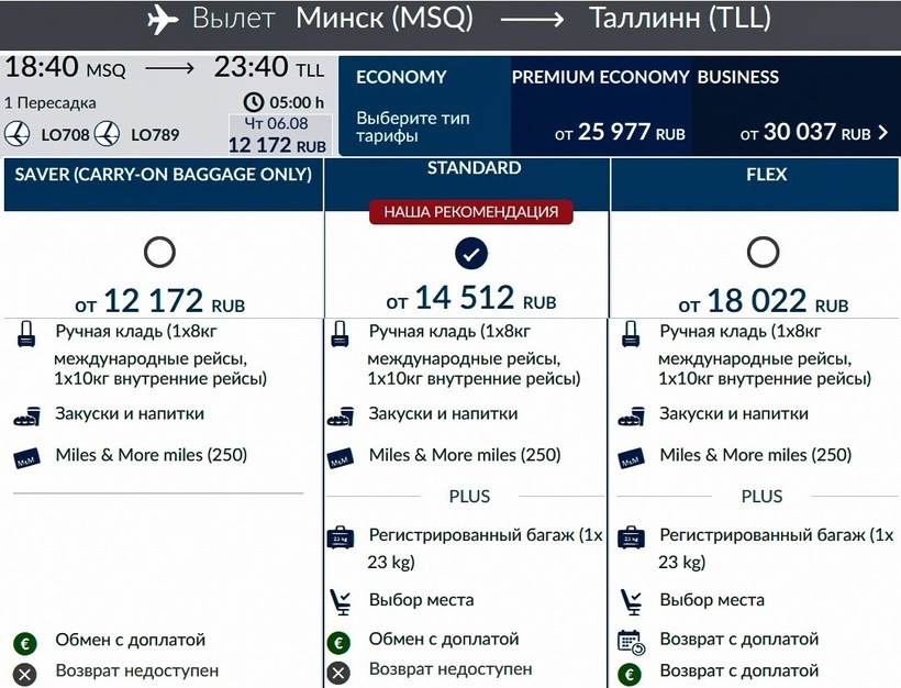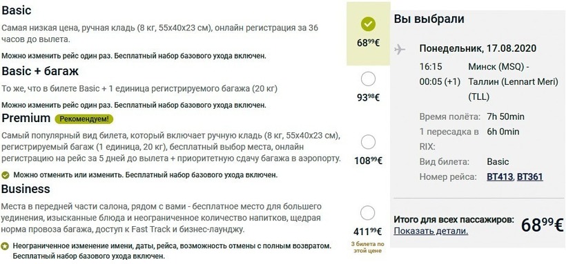 В весенне-летнее время однозначно советую преодолевать расстояние между столицами Беларуси и Эстонии прямыми авиарейсами Belavia. Кроме того, что время в пути с данным перевозчиком минимальное, также и стоимость билетов у него самая низкая. Но, напомню, перелеты белорусская компания выполняет не ежедневно. В осенне-зимнее время самые недорогие авиабилеты туда-обратно предлагают airBaltic и LOT (цены сопоставимы). Но поскольку я преодолевала маршрут только в одну сторону, предпочла путешествие с балтийским оператором, у которого стоимость перелета была ниже на 4500 ₽, чем у польской авиакомпании. Кроме того, с airBaltic я потратила на 3 часа меньше времени, чем если бы летела с LOT. Любителям бизнес-класса советую полет с польским авиаперевозчиком, потому что проездные в данный класс у LOT дешевле на 1500 ₽, чем у балтийской компании, на 9000 ₽, чем у Lufthansa, и на 39000 ₽, чем у «Аэрофлота».