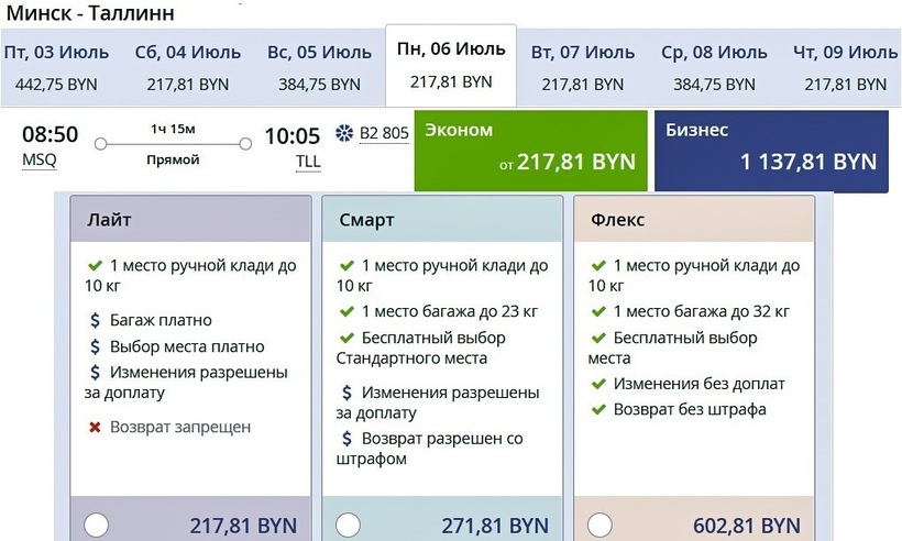 Белавиа (B2 805) Embraer EMB 175 | 15:50 Минск (MSQ) | 1 ч. 15 мин | 17:05 Таллин (TLL) | вт, сб по 19.10 |