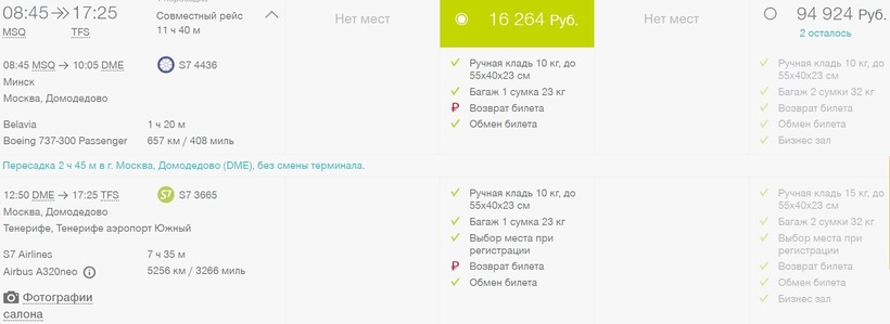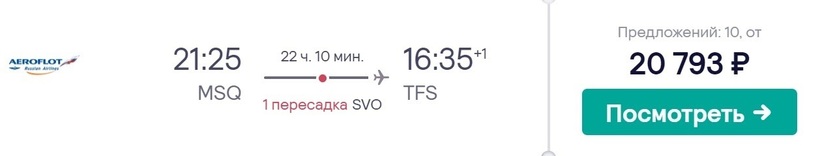В Тенерифе придется лететь стыковочными рейсами — прямого авиасообщения между городами нет. Самолеты российской а/к «Аэрофлот» летают по маршруту Минск — Москва — Тенерифе в ежедневном режиме (кроме среды). Всего перевозчик предлагает от одного до четырех вариантов перелетов, продолжительность которых вместе со стыковкой от 14 часов до практически 1,5 суток. Пересадки всегда проходят в Шереметьево. Это самая большая авиагавань столицы РФ. Длительность стыковок от 4 часов до суток. Внутри аэровокзального комплекса есть: