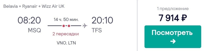 Так как бюджет был ограничен, то оптимальным вариантом оказался перелет с двумя стыковками с «Белавиа», Ryanair и Wizz Air UK. Напомню, что цена билетов от 7900 рублей. Плюс стыковки вполне комфортной продолжительности — 3,5 и 3 часа соответственно, а общее время в пути около 15 ч. При этом расписание у перевозчиков также вполне удобное. Отправление утром, прибытие в Тенерифе вечером (не поздно). Также не забывайте про разницу во времени между городами, которая составляет три часа.