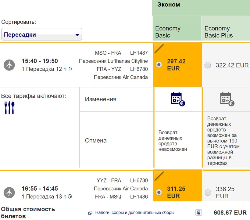 Lufthansa (по код-шеринговому соглашению с Air Canada). У немецкой авиакомпании самое удобное расписание рейсов — летают самолеты по маршруту ежедневно. С пересадкой во Франкфурте от 1 ч. путешествие займет от 12 ч.