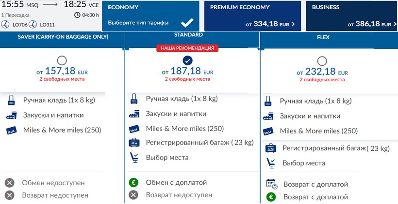 Если мне удается подстроиться под график LOT, я предпочитаю преодолевать маршрут с ним, потому что авиабилеты у компании самые дешевые: только туда с багажом в среднем стоят 13000–14500 ₽, если купить и на обратный путь — от 20000 ₽. Бизнес-класс — от 27500 ₽.