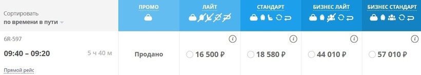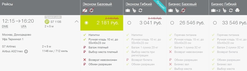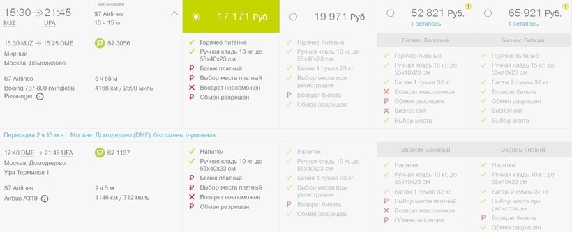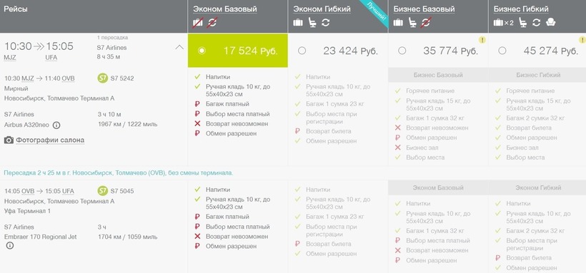 Цены актуальны за неделю и более до вылета. Но если в ваших планах лететь в канун или во время праздников, есть смысл бронировать билеты заранее (за 3–6 месяцев). В такие периоды S7, как и многие перевозчики, поднимает цены (минимум на 10%). Можно получить скидку, если купить билет не только туда, но и обратно. В таком случае полет в один конец со стыковкой в Москве обойдется в 13500 рублей, а со стыковкой в Новосибирске — в 16700 рублей. Авиаоператор для этих маршрутов предлагает четыре тарифных плана на выбор: два — в экономический класс обслуживания и столько же — в бизнес-класс. Советую выбрать оптимальный по стоимости и включенным услугам «Эконом Гибкий». Опции тарифа: