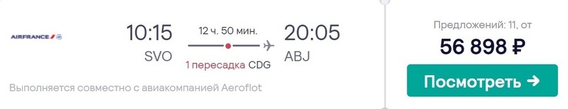 Начну с того, что прямое авиасообщение между городами отсутствует, из Москвы в Абиджан можно попасть только стыковочными рейсами. Один из самых оперативных способов добраться до конечного пункта, совершив одну пересадку — купить билет на совместный рейс «Аэрофлота» и Air France. Тринадцать часов и вы на месте. Стыковка в аэропорту Парижа (Шарль-де-Голль) — 2 ч. Билеты только туда за пару недель — от 56900 рублей.