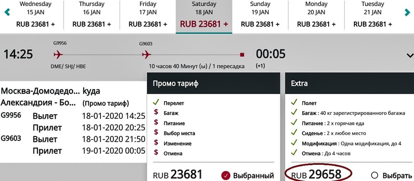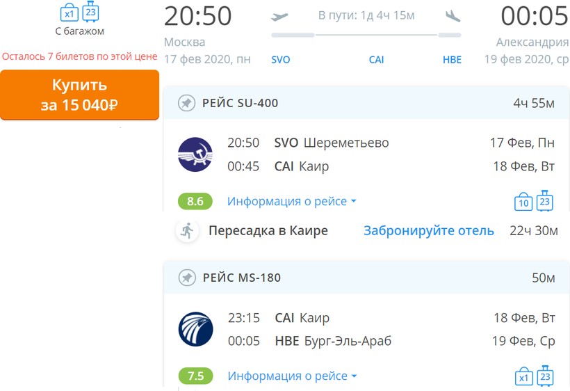 Кроме описанных вариантов рейсов, всего за 15000 ₽ (только туда) можно преодолеть расстояние между городами с «Аэрофлотом» и EgyptAir через Каир. Недостаток в том, что пересадка в столице Египта длится 22,5 часа, а весь полет займет 28 ч. С другой стороны, такая продолжительная стыковка позволяет отправиться к знаменитой пирамиде Хеопса.