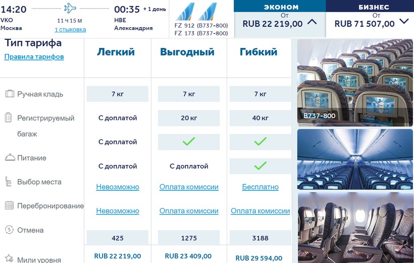 Несмотря на то, что Air Arabia — лоукостер, перелет у него довольно дорогой: авиабилеты с багажом только туда можно купить за 29500 ₽, в обе стороны — от 40500 ₽. Бизнес-класса у бюджетной компании нет.