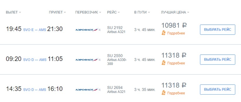 Самый крупный российский оператор предлагает гораздо больше рейсов. Добраться до Амстердама можно утром, днем и вечером. Вылеты осуществляются из Шереметьево.