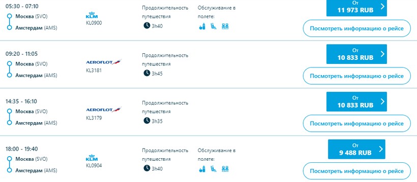 Нидерландская авиакомпания летает по маршруту несколько раз в день. Обратите внимание, что некоторые перевозки выполняет «Аэрофлот», но билеты на них по код-шеринговому соглашению продает и KLM.