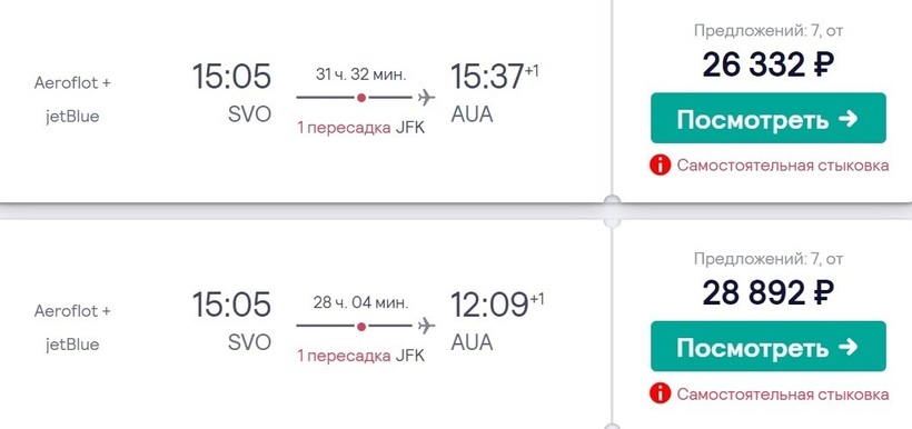 Этот вариант перелета подразумевает самостоятельную стыковку. В аэропорту пересадки нужно забрать и заново сдать багаж, и зарегистрироваться на следующий рейс до Арубы. Относительно недорогие перелеты можно найти и с двумя-тремя пересадками. Так, потратив на дорогу немногим более суток до конечного пункта можно добраться с «Аэрофлотом» и Copa Airlines (флагманская а/к Панамы). Билеты за 4 месяца до полета — от 24100 рублей. Первая пересадка в аэропорту Нью-Йорка имени Джона Кеннеди — около 7,5 ч., вторая в Панаме — воздушная гавань Токумен — примерно 3 ч. Если можете потратить на дорогу примерно 1,5 суток, и не смущает количество пересадок, то могу вам порекомендовать перелет с тремя стыковками вместе с TAP Air Portugal (национальный перевозчик Португалии) и Copa Airlines. Первая стыковка в Лиссабоне (авиаузел Портела) — 4,5 ч., вторая в Майами — около 8 ч., третья в Панаме — авиаузел Токумен — 1,5 ч. Опять же тут перелет через США и нужна транзитная виза. Стоимость за 3 месяца до вылета — от 21500 рублей.