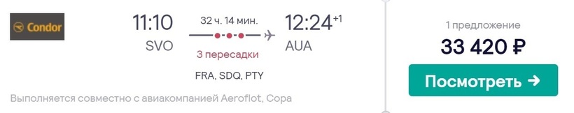 Прямые авиарейсы по маршруту отсутствуют. Удобнее всего со стыковкой добраться в Арубу с KLM (национальная а/к Нидерландов). Некоторые рейсы выполняются совместно с «Аэрофлотом». Минимальное время в пути — 15,5 ч. Максимальное — около 1,5 суток. Ежедневно перевозчик предлагает 1–5 вариантов (все зависит от сезона) перелетов со стыковкой в Амстердаме — аэропорт Схипхол. Советую выбирать рейсы с минимальным временем на пересадку в столице Нидерландов, чтобы побыстрее добраться до конечного пункта. Можно утром вылететь из столицы и за 3 часа и 45 минут добраться до Амстердама. На пересадку потратите всего 1,5 ч. Следующий рейс до Арубы продлится 10,5 ч. На месте будете вечером (по местному времени). Общее время в пути — 15,5 ч. Теперь о ценах на билеты. За два месяца до вылета авиабилет можно купить за 74300 рублей. Накануне поездки эта цифра может быть выше в 1,5 раза. Если бронировать билеты за полгода, то их можно найти за 68000–70000 рублей. Обратные обойдутся примерно в такую же сумму.