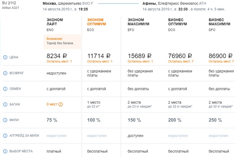 У «Аэрофлота» есть удобная система тарифов авиабилетов для экономкласса: