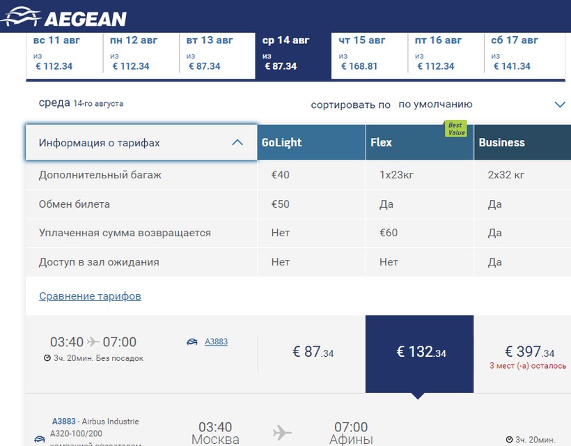 Aegean совершает авиарейсы по код-шеринговому соглашению совместно с российской компанией S7. Расписание полетов не самое удобное — в будние дни выполняется всего один прямой рейс, и он ночной. Хорошо, что хоть по субботам и воскресеньям есть дополнительный дневной вылет.