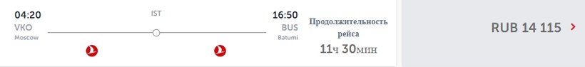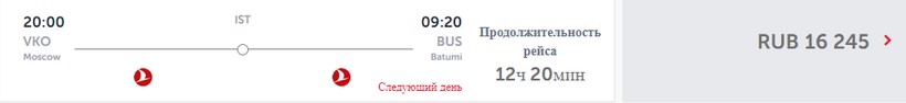 Turkish Airlines вылетает в Батуми днем, получается трехчасовая пересадка. В принципе, этого времени вполне хватает для регистрации и сдачи багажа. Таким образом, весь перелет займет в районе 8 часов. Однако стоимость билетов довольно высокая. При покупке за пару недель до отправления нужно будет заплатить практически 20000 рублей.