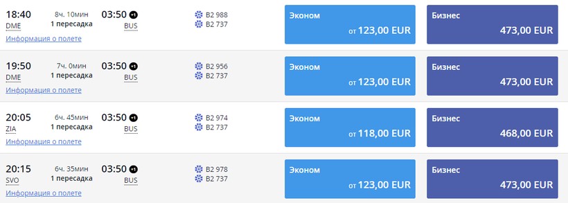 С данной авиакомпанией можно долететь дешевле, она совершает полеты со стыковкой в Минске. Минимальная полетное время составляет 6,5 часа. Стыковка короткая, около двух часов.