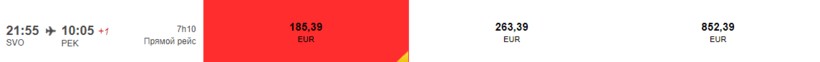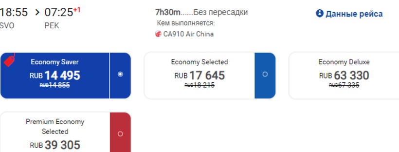 | Air China (CA 910) Boeing 777-300ER | 20:10 Москва (SVO) | 7 ч. 20 мин | 08:30 Пекин (PEK) | ежедневно по 26.03 |